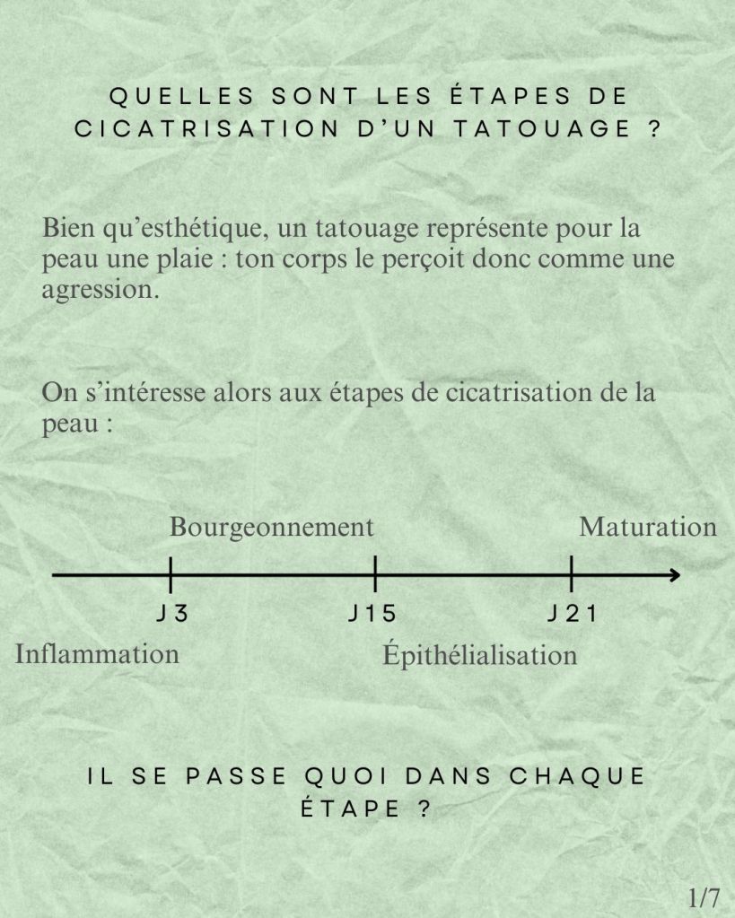 Pour aborder tout ça correctement, il faut déjà comprendre ce que provoque un tatouage dans la peau, et comment notre corps réagit. Parce qu’un tattoo, c’est une plaie. Et comme pour toute plaie, le corps suit des étapes précises pour se réparer.